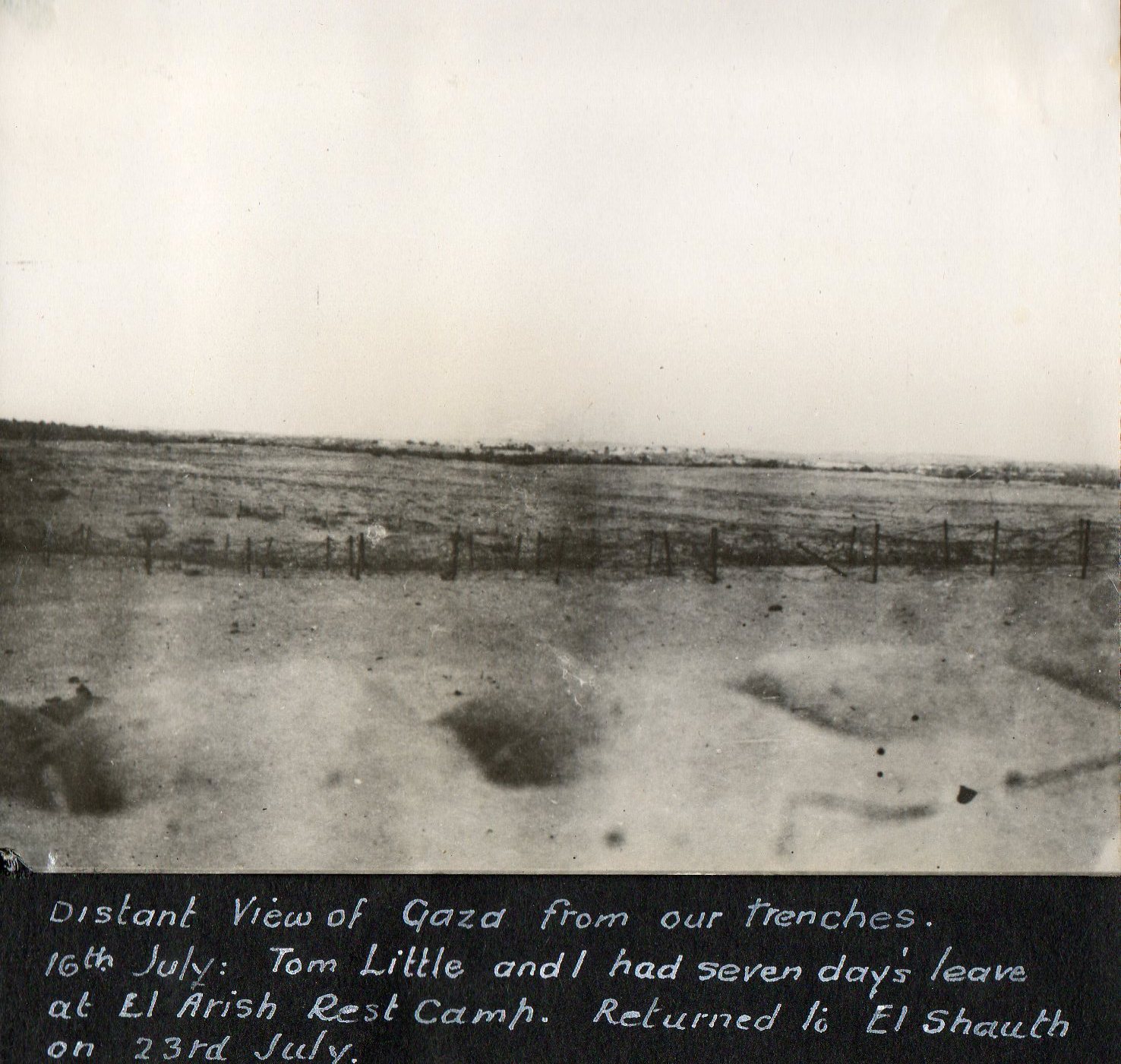went forward of the desert and reported: One day's outing was very exciting as we had our first peek of the promised land. Rafa is the old frontier between Palestine and Egypt the Turks fixed this because there is