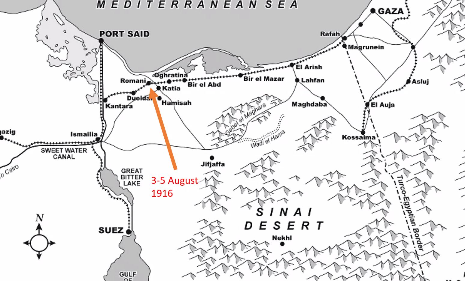 This allowed the long advance across the Sinai Desert to start in pursuit of the Turks and the advance to Palestine and beyond. The Sinai was a sand desert, hot and dry with no refuges or settlements of any size end route. The Allies built a narrow gauge railway and a water pipeline to support the troops and the advance could only be made at the pace these support systems could be built.