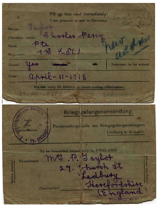 In 1918 he deployed to the Western Front and was attached to 1st Battalion Kings Shropshire Light Infantry and was taken Prisoner of War on 21 March 1918 during the German Spring Offensive. He was posted as 'missing presumed killed in action'. He was a PoW and sent a 'standard' postcard to his wife.