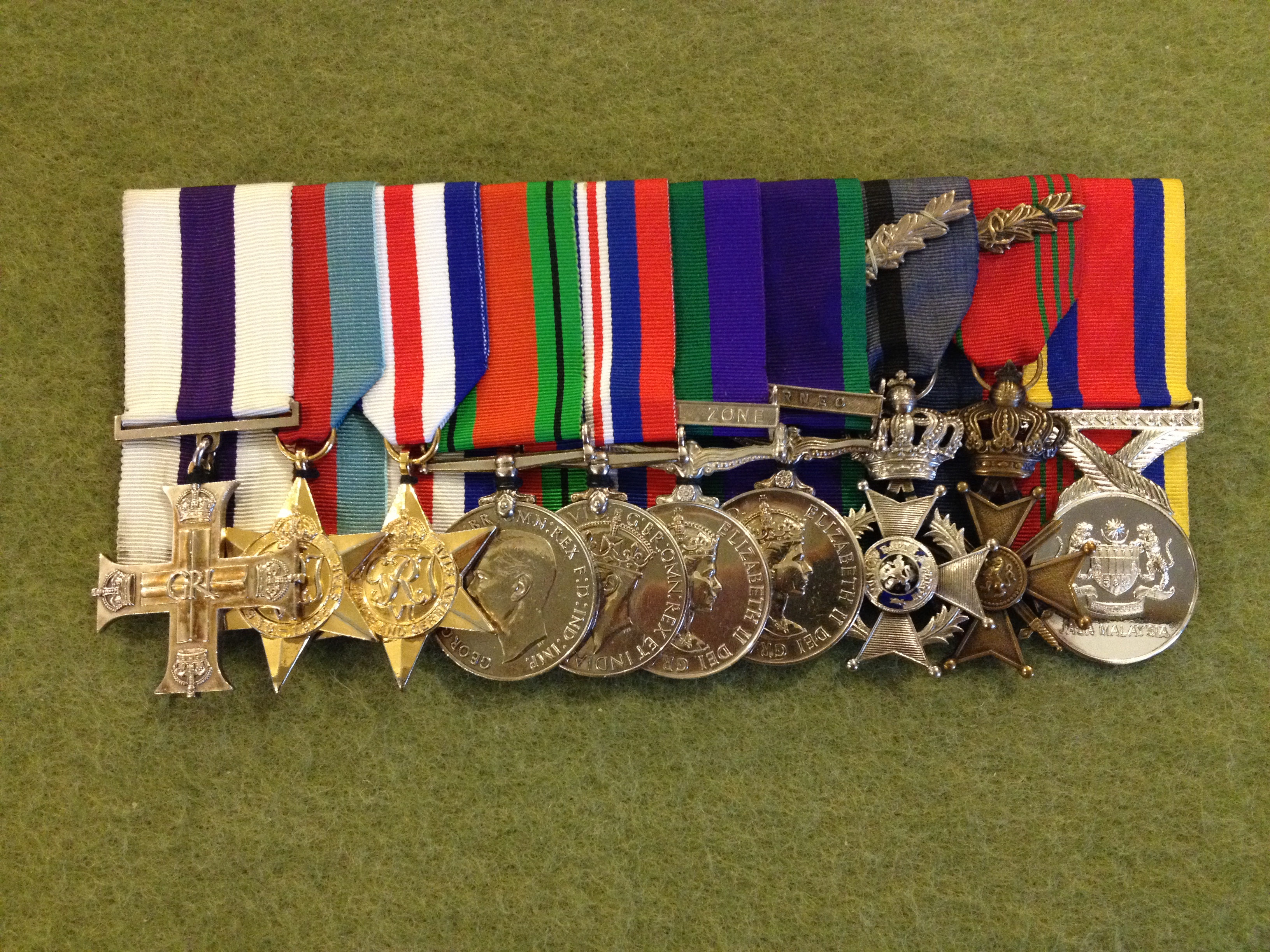 Military Cross, 39/45 Star, France & Germany Star, Defence Medal, War medal, General Service Medal 1918-62 with bar 'Canal Zone' (authorised and issued 2003), General Service Medal 1962-2007 with bar 'Borneo', Chevalier of the Order of Leopold (Belgium), Croix de Guerre (Belgium), Pingyat Jasa Malaysia (authorised and issued 2004).