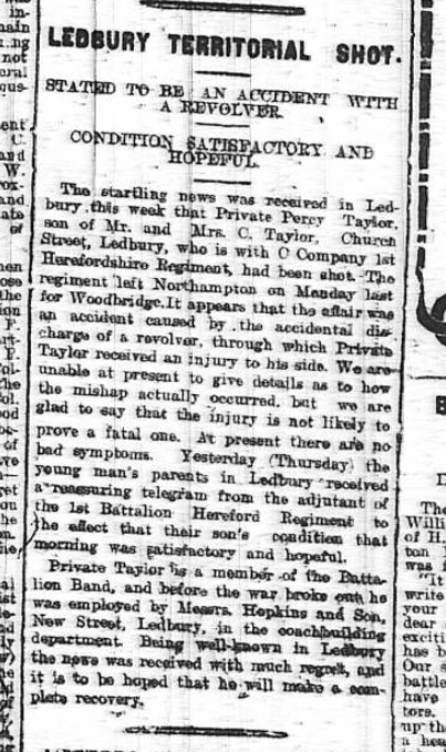 He was mobilised on the outbreak of war in August 1914 and was accidentally shot in December 1914. The bandsmen became batmen and after a route march the batmen were cleaning their officers revolvers; one officer had loaded his revolver unknown to his batman who then accidentally discharged the weapon wounding Pte Taylor. He was the transferred from the 1st Battalion and as a result of his wound did not deploy with the Battalion to Suvla Bay.