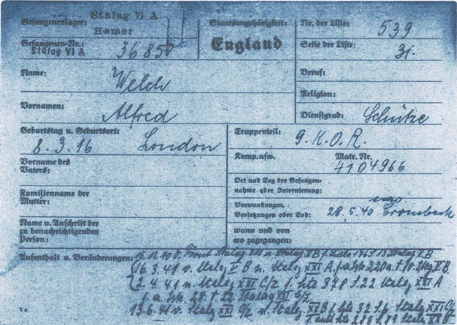 Alf’s medal entitlement was the 1939/45 Star and the War Medal – as PoW he did not qualify for the Defence Medal, and those that served at Dunkirk did not receive the France and Germany Star. The town of Dunkirk issued a Dunkirk Commemorative Medal in 1960 although not an official medal it was worn by many Dunkirk men as a semi official medal), but this was designed for those who took part in Operation Dynamo and those that were ‘lifted’ off the beaches – again Alf did not qualify.