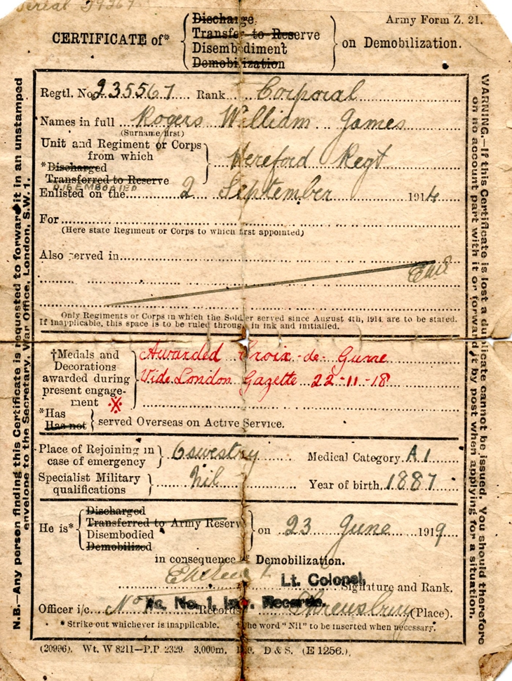 Sjt Rogers from Hereford enlisted into The Herefordshire Regiment in September 1914, soon after the outbreak of the First World War. He was discharged in June 1919.