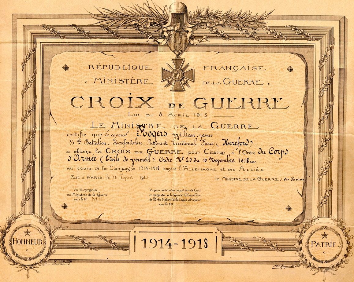 He was awarded the French Croix De Guerre, published in the London Gazette in November 1918. He was also entitled to the 1914/15 Star, British War and Victory Medals.