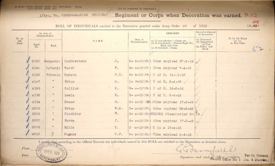 It is not known when he enlisted but he served with the Regiment at Suvla Bay in 1915. His 4 figure number starting with an '8' indicates he was recruited in Radnorshire. Although part of the Herefordshire Regiment the sub units in Radnorshire were administered and allocated Regimental numbers by the Radnorshire Territorial Association. It is most likely that he was a pre-war enlistment as those pre war volunteers had their terms of enlistment honoured and could be discharged at the end of their agreed service - even when the war was still on - this was changed later in the war and they were retained.