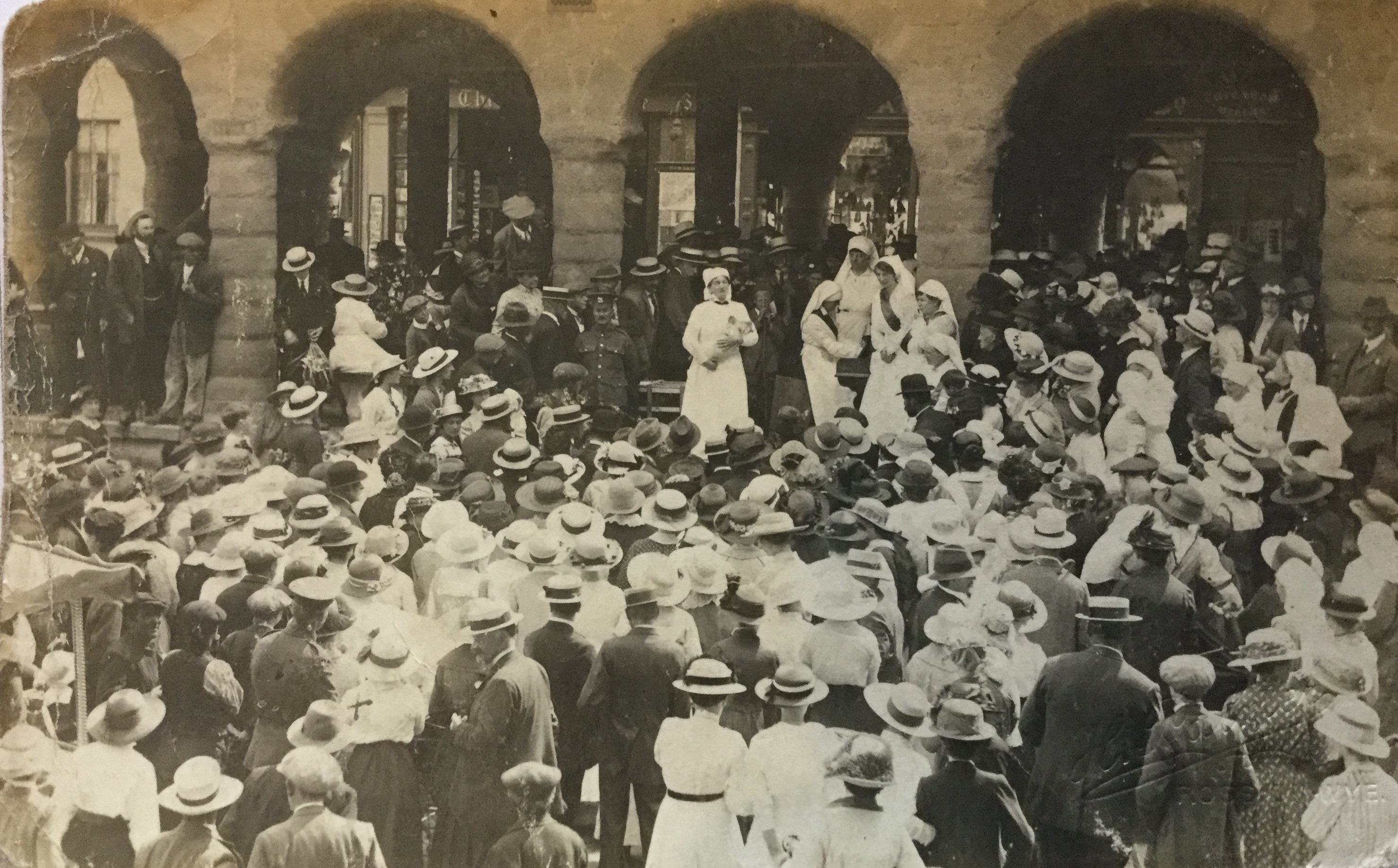 At first passing the 'then' photograph appears to be a First World War era photograph with a member of The Herefordshire Regiment in uniform stood on the steps, and another bottom left hand corner. However on further examination it is more likely a 'hospital flag day' - raising funds for the local hospital before the introduction of the NHS. There appear to be lots of nurses - and no red crosses on their bibs which seemed to be the normal for VADs during WW1 - and it looks like the central nurse/speaker is holding a baby.