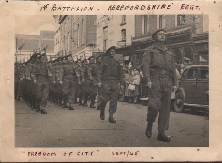 At a city council meeting of 29th May 1945 the council voted unanimously to award the Freedom of the City to the Herefordshire Regiment. The honour has its roots in history and allowed ‘freemen’ to carry on certain activities within the city free of some taxes, tolls and dues. The Honour is now symbolic and for military units allows them to march through the city with ‘drums beating, bands playing, Colours flying and bayonets fixed’.
