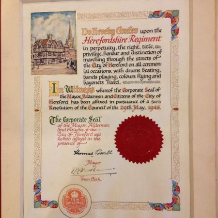 The right of freedom has been passed to the successors of the Herefordshire Regiment and is now enjoyed by The Rifles Regiment who last exercised their rights of Freedom in June 2019, on the 100ths anniversary of the signing of the Treaty of Versailles which ended the First World War.