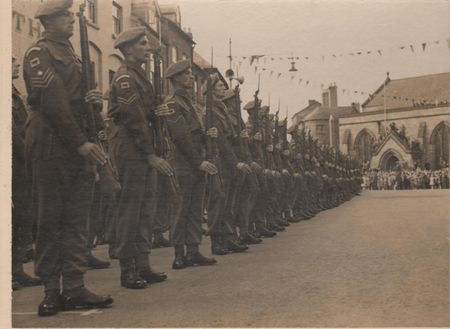 On 29th September a party of soldiers from the Regiment, under Major WAP Crofts MC returned from Germany to take part in the Freedom Parade. Maj Crofts had served with the Regiment throughout the war and had been awarded the Military Cross in August 1944 when he demonstrated great powers of leadership on at least 2 occasions when he led assaults on enemy positions under heavy machine gun and mortar fire capturing and consolidating the positions. Maj Crofts had also been present at the capture of Admiral Doenitz.