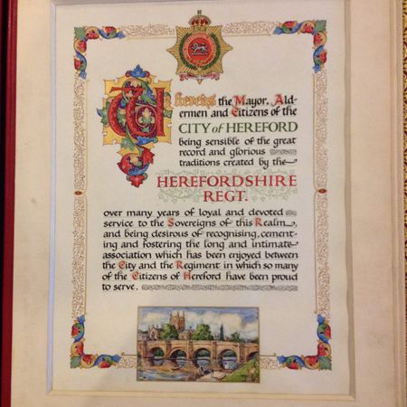 The Battalion marched through the city and then paraded in St Peters Square to be addressed by the Mayor and presented with the Freedom document. The Mayor, Councillor T Powell in his address said - The citizens of Hereford are proud of their Regiment. They give thanks to those who have come safely through the fires of battle. They remember with deepest sympathy those who are left to mourn.
