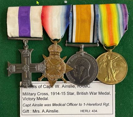 Williams Ainslie had served with the Herefordshire Rifle Volunteers and was a founding member of the Herefordshire Regiment on its formation in 1908. He was born in Scotland in 1877 and trained at Aberdeen University where he qualified as a doctor in 1897. He had served as a corporal in the Volunteer Medical Staff Corps whilst at university (1893-97). He was Commissioned into the Royal Army Medical Corps on 14 September 1914 and served at home before going overseas to France on 14 December 1914. He was awarded the Military Cross announced in the London Gazette in January 1917.