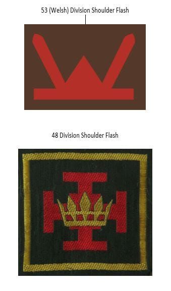 In 1961 the Battalion, as part of 159 Bde became part of 48 Division whose HQ was in Shrewsbury, and wore their shoulder flash consisting of: the gold crown of Offa, King of Mercia (AD 757), superimposed on the red cross of St Chad, on a green square surrounded by a gold border.
