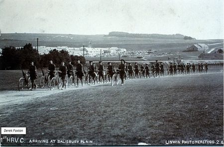 The HRVC, in addition to pioneering the organization of bearer companies, also pioneered the formation of infantry cyclist sections, which were later authorized for the Volunteer Force as a whole in the Volunteer Regulations of 1893, with an establishment of 1 officer, 2 NC0s, 20 privates and 1 bugler. The Cyclist Section of 1st HRVC was formed in 1888 by Maj Scobie. In 1888 it took part in the Cheshire manoeuvres in the neighbourhood of Reading under the same officer. In the autumn of 1889, Maj. Scobie obtained leave from the War Office to form a cyclist camp at Tintern, and this is claimed to have been the first authorized by the War Office. Cyclist Sections from 1st Volunteer Battalion K (SLI), 2nd Volunteer Battalion SWB and 3rd Glamorganshire Volunteer Artillery joined the Herefordshire section, all of which were commanded by Maj Scobie. The Cyclist Section was later commanded by Lt FH Leather.